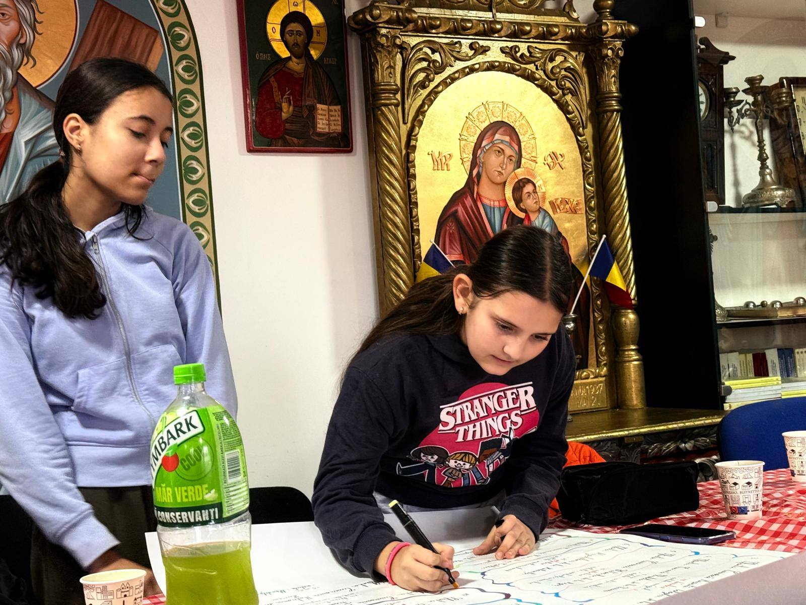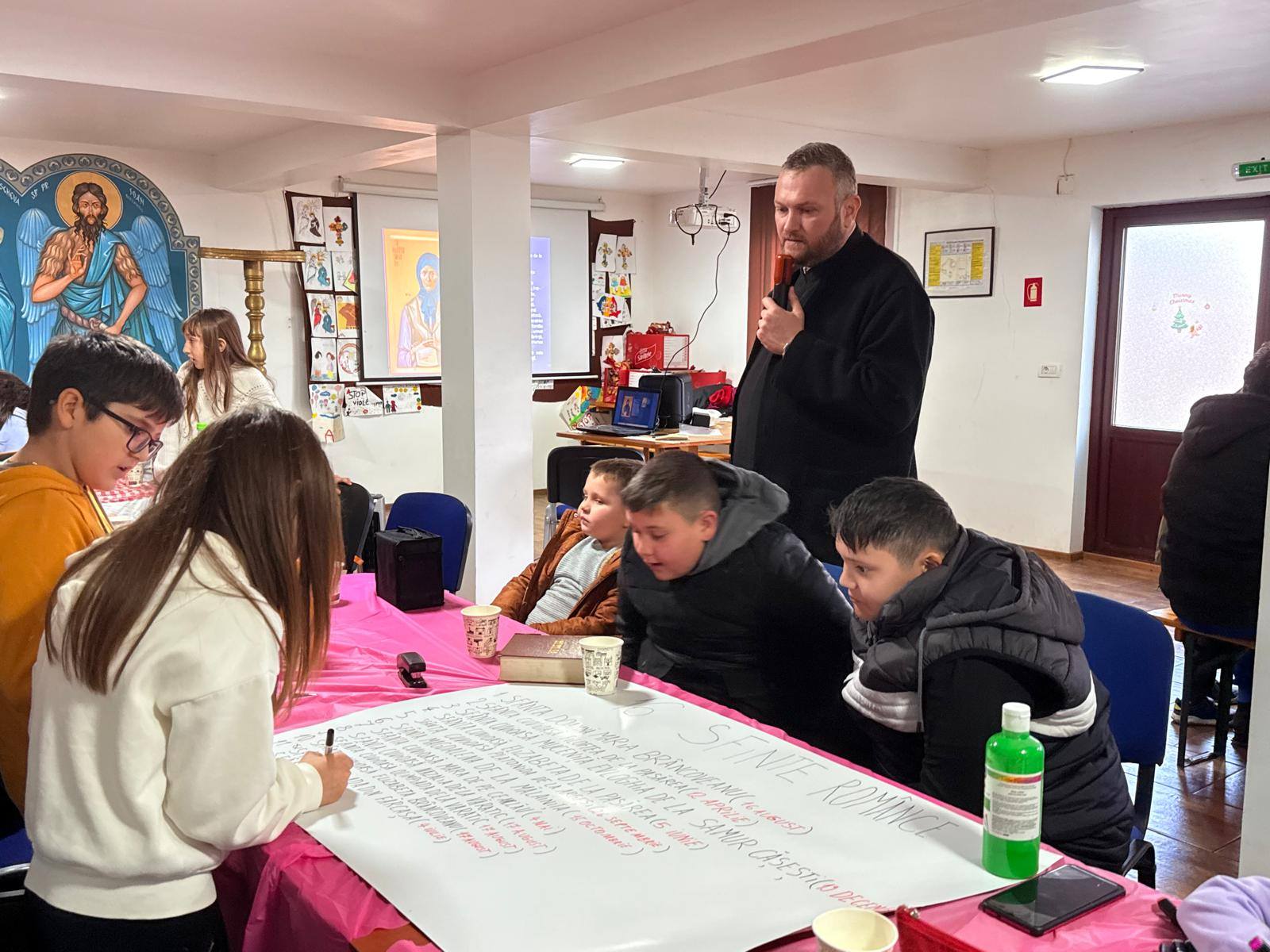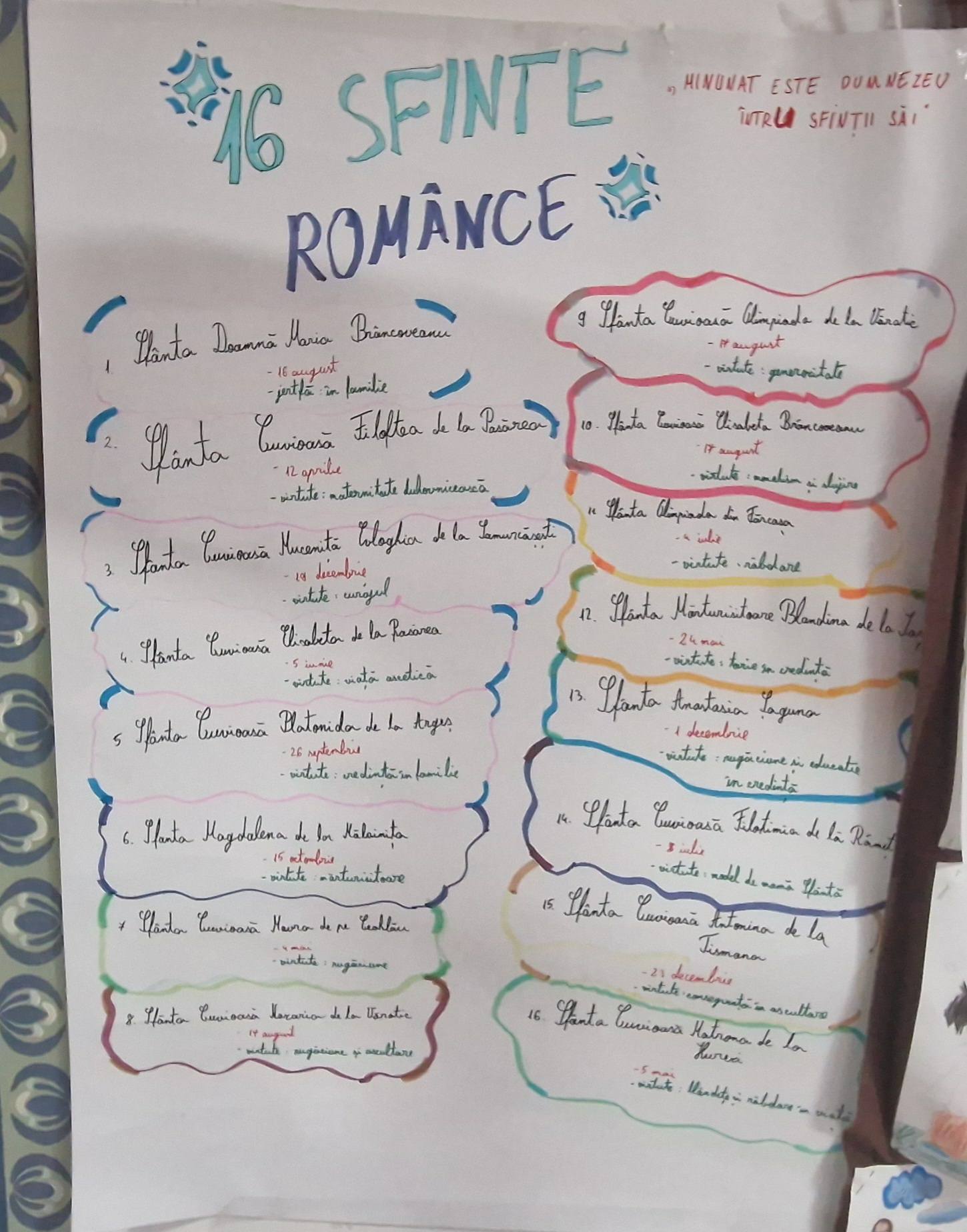 Lucrând cu seriozitate și entuziasm, copiii au realizat planșe cu numele celor 16 sfinte, data de cinstire și virtutea caracteristică fiecăreia, demonstrând implicare, creativitate și spirit de echipă.