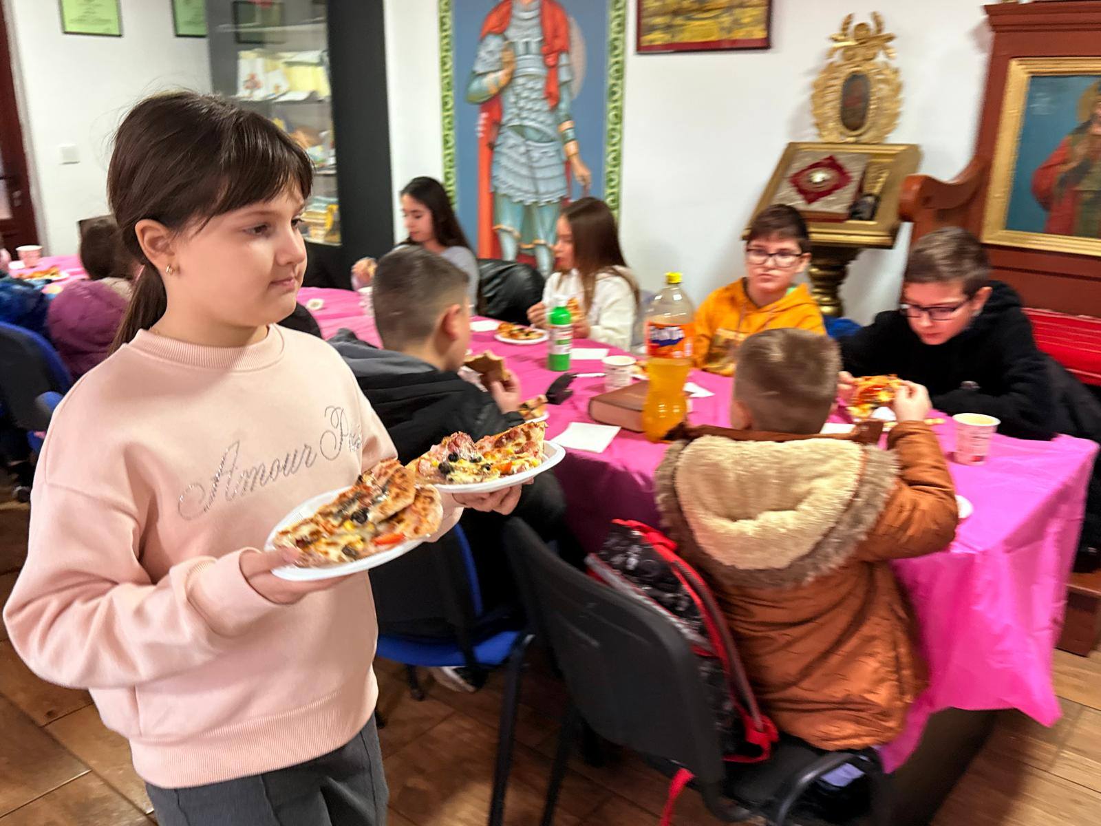 Întâlnirea s-a încheiat într-o atmosferă caldă de comuniune, copiii fiind serviți cu pizza suc și croissant cu ciocolată.