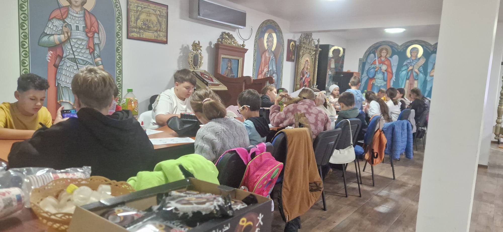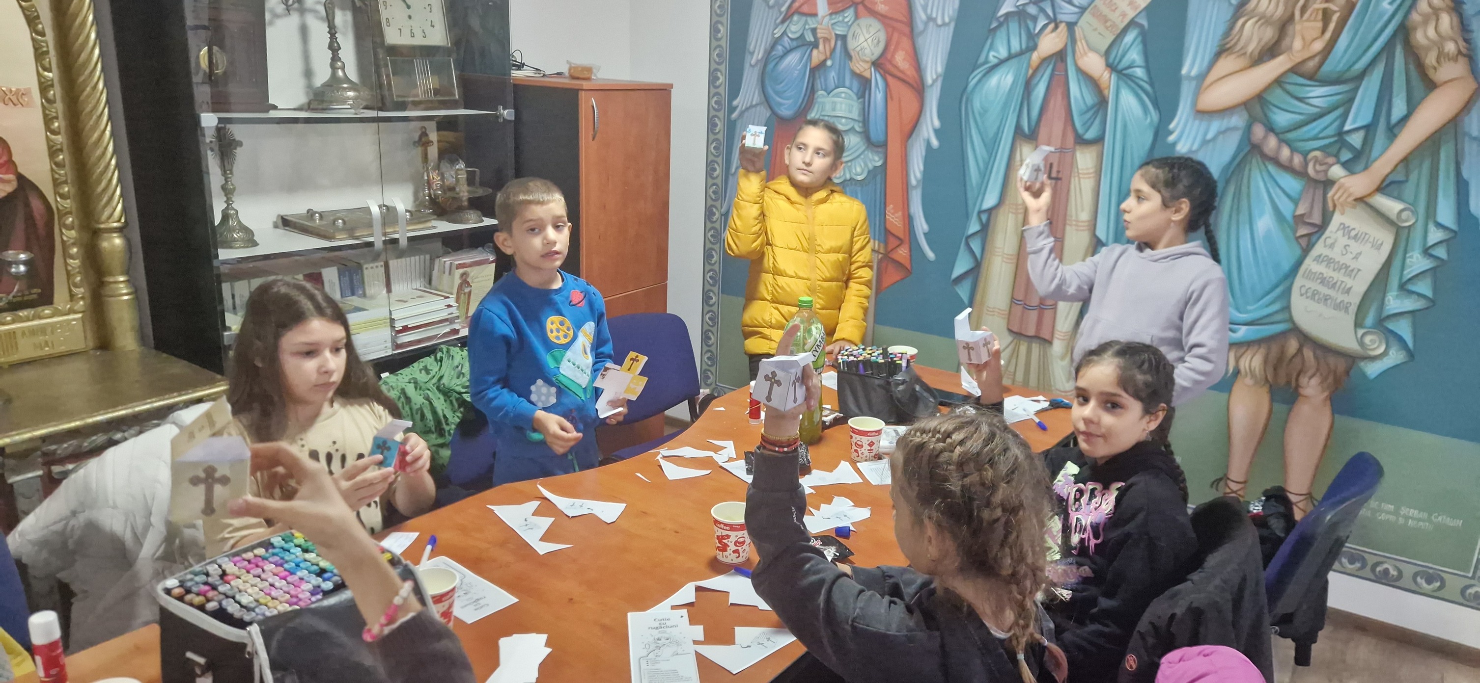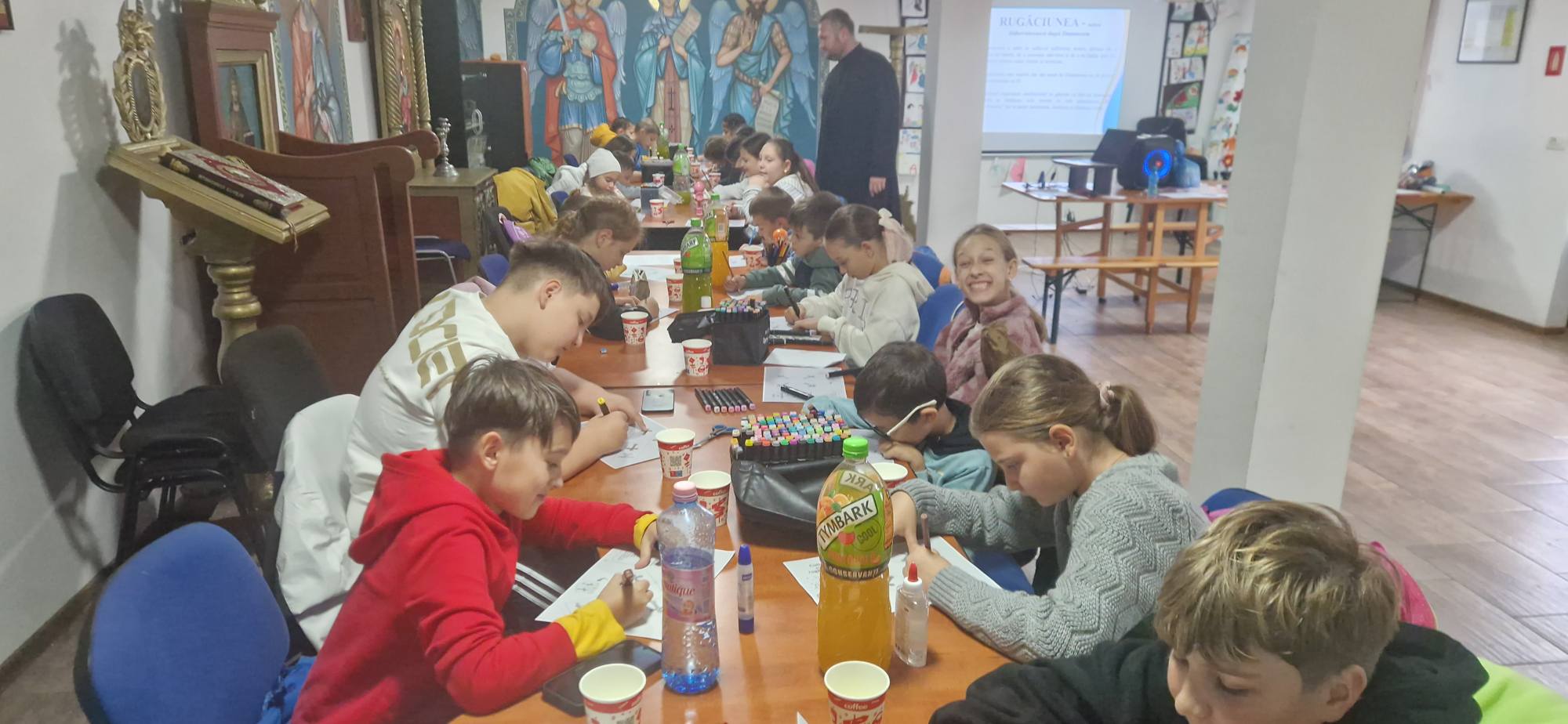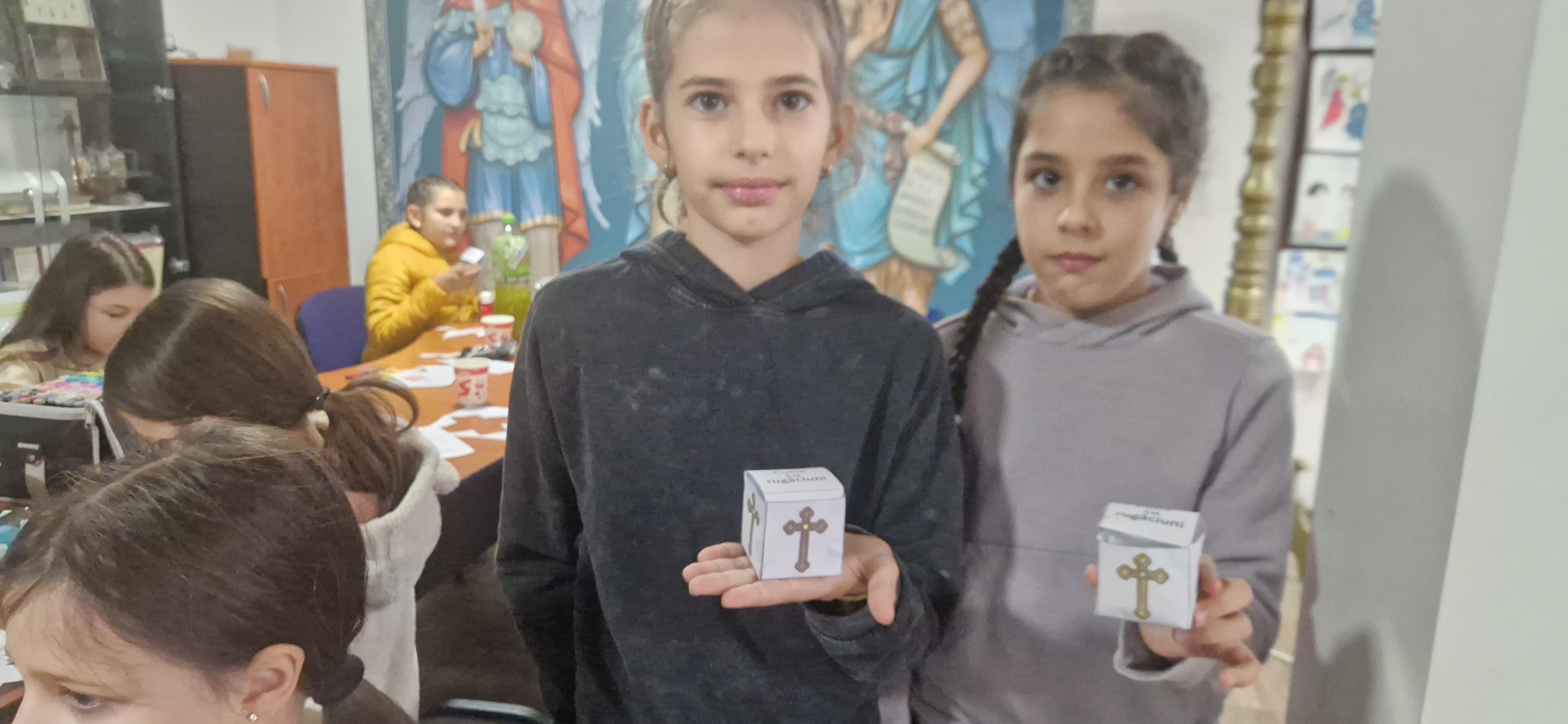 Copiii au urmărit cu interes un material PowerPoint interactiv și s-au bucurat de un moment dulce cu gogoși cu ciocolată și suc. Activitatea practică i-a implicat într-un exercițiu creativ și personal: fiecare a realizat o cutie cu rugăciuni, pe care au colorat-o, decupat-o și montat-o cu grijă. Apoi au scris pe bilețele cuvinte și motive de rugăciune – un gând, o nevoie, o persoană dragă. La final, fiecare copil a extras un bilețel și a plecat acasă cu un îndemn de rugăciune pentru săptămâna ce urmează.