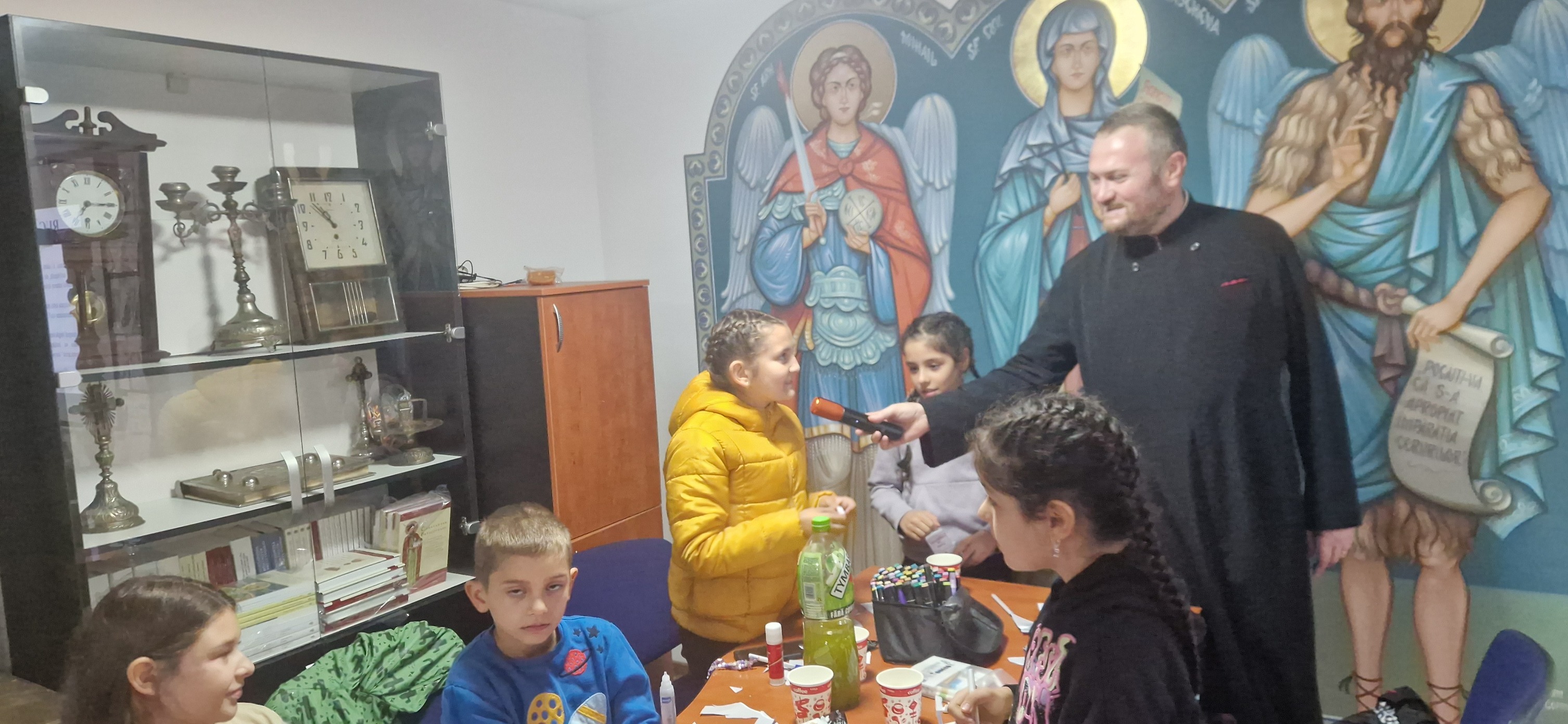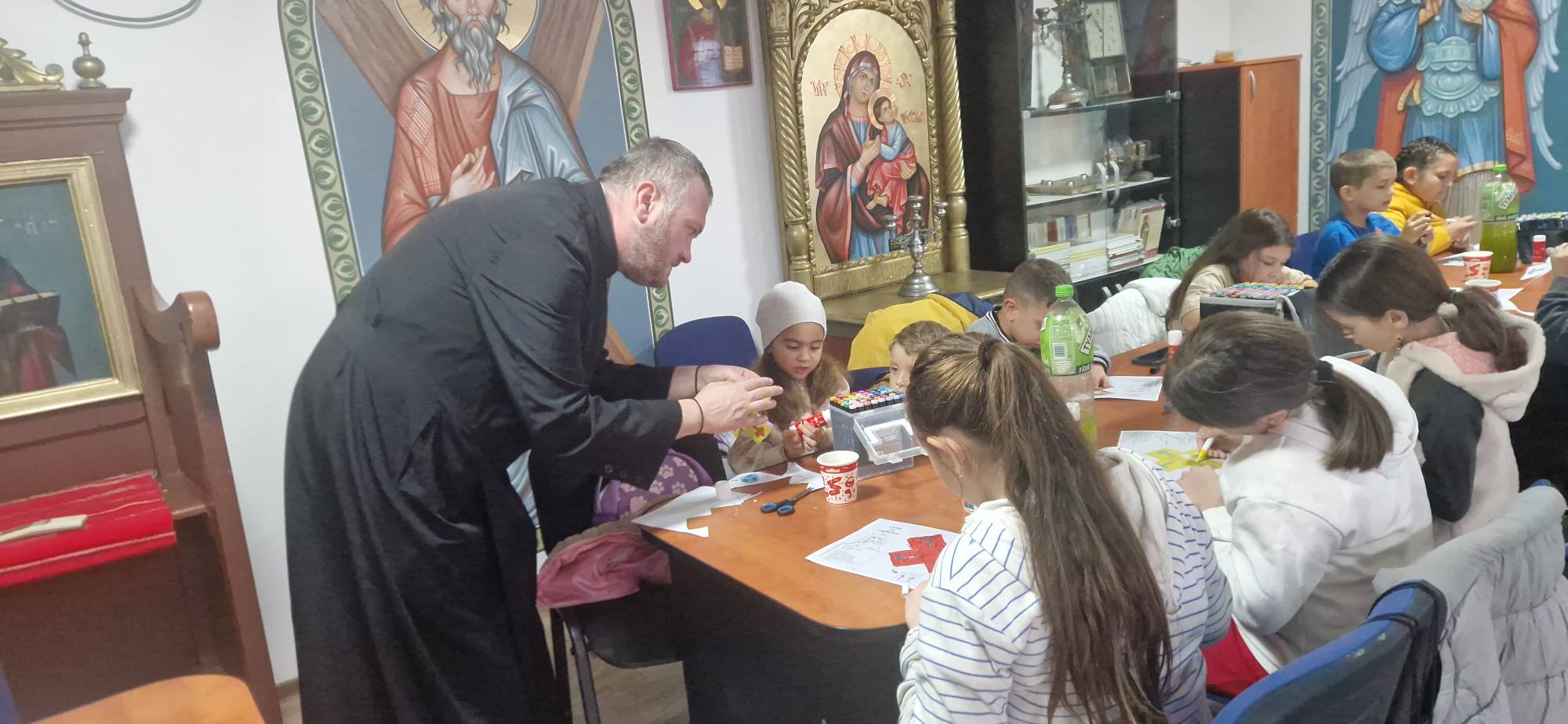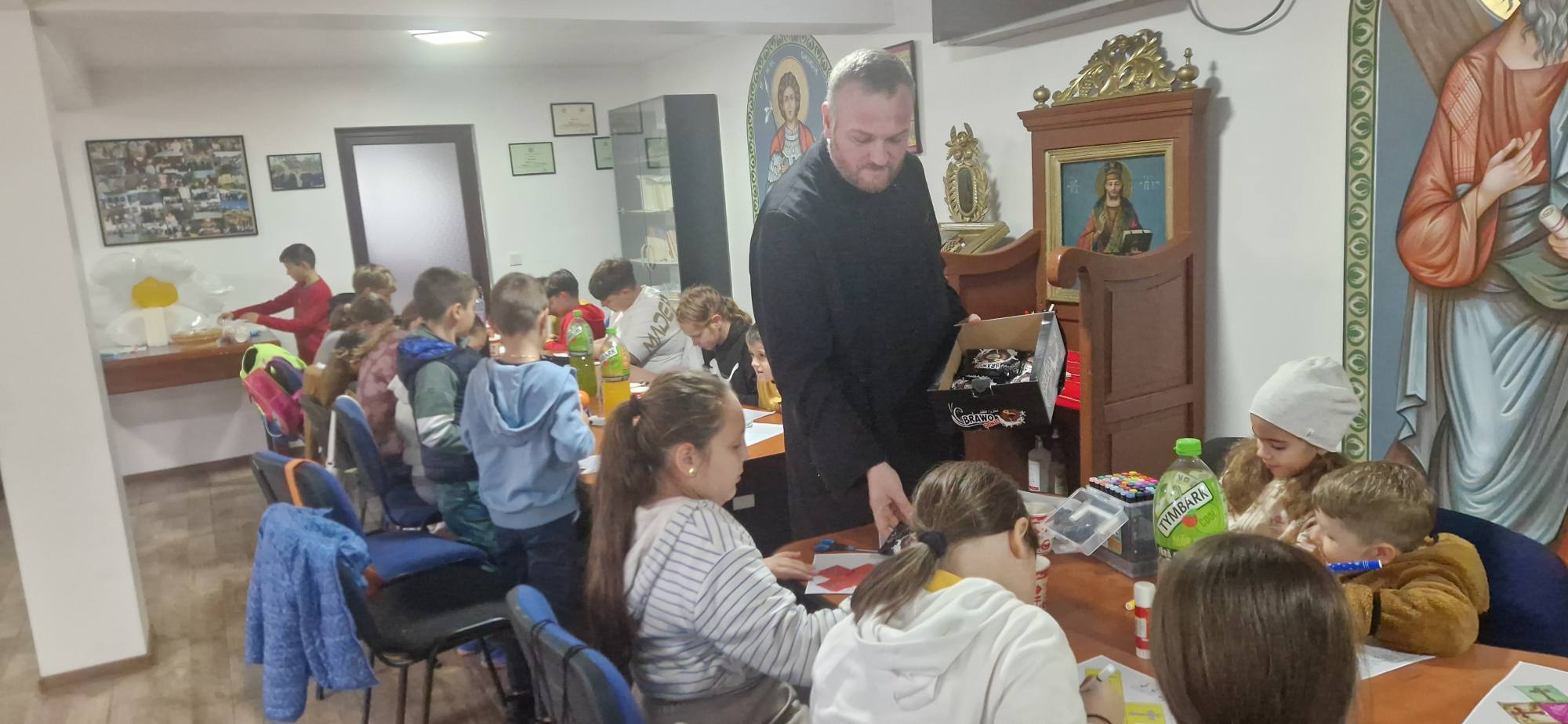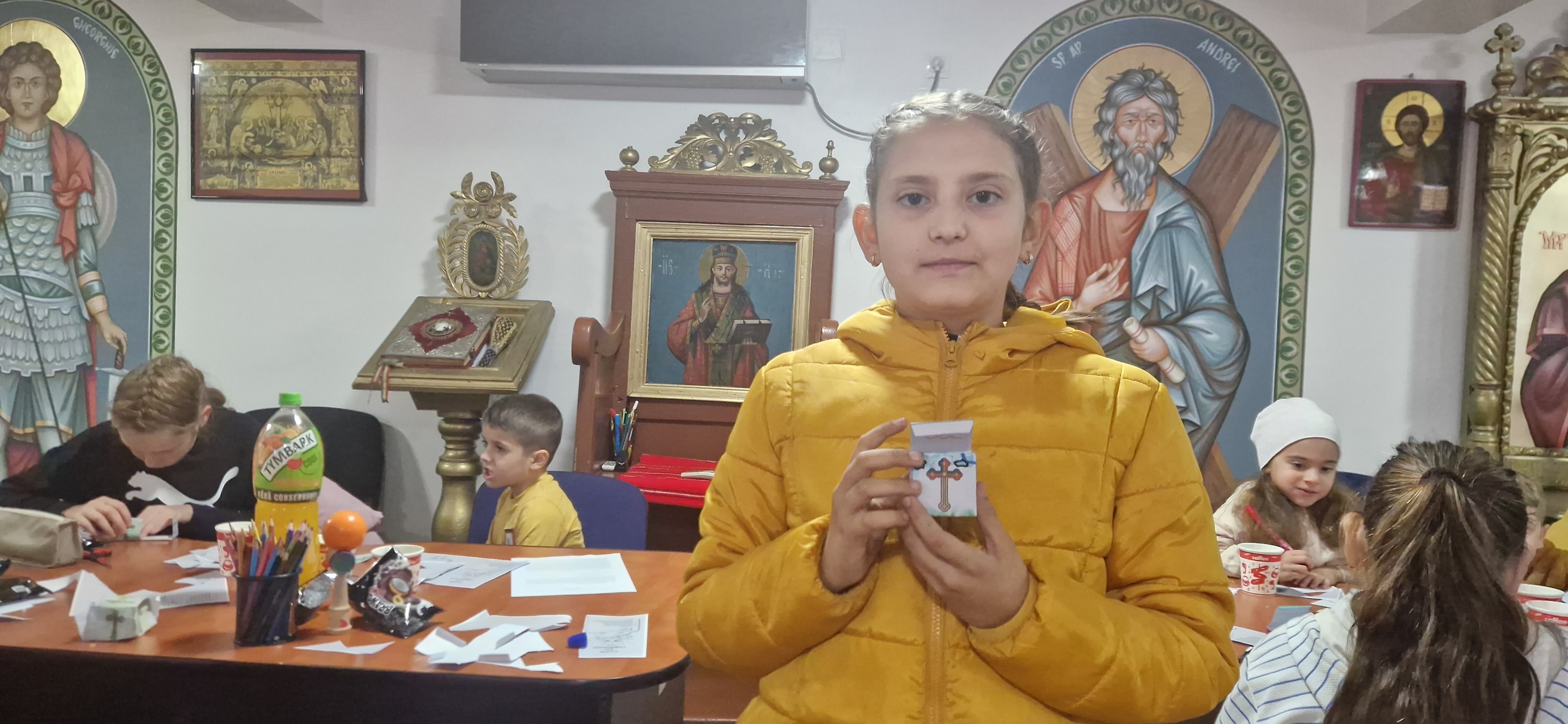 Copiii au urmărit cu interes un material PowerPoint interactiv și s-au bucurat de un moment dulce cu gogoși cu ciocolată și suc. Activitatea practică i-a implicat într-un exercițiu creativ și personal: fiecare a realizat o cutie cu rugăciuni, pe care au colorat-o, decupat-o și montat-o cu grijă. Apoi au scris pe bilețele cuvinte și motive de rugăciune – un gând, o nevoie, o persoană dragă. La final, fiecare copil a extras un bilețel și a plecat acasă cu un îndemn de rugăciune pentru săptămâna ce urmează.